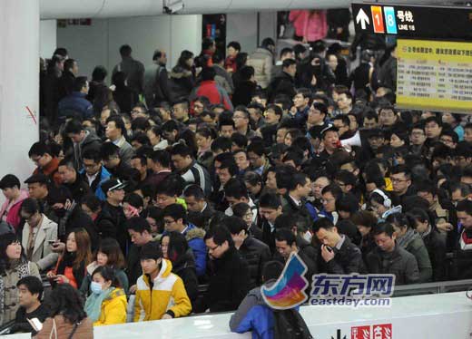 记者在南京东路地铁站看到,由于2号线部分中断运营,前往虹桥火车站、虹桥机场的旅客只能换成10号线,这里也积压了不少旅客。